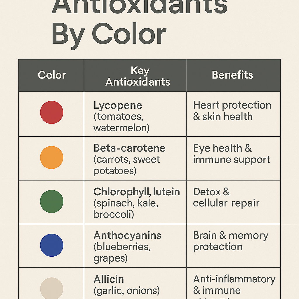Antioxidants are found in the pigments that give plants their color—reds, purples, oranges, greens, and blues. Each hue represents unique compounds that defend your body: